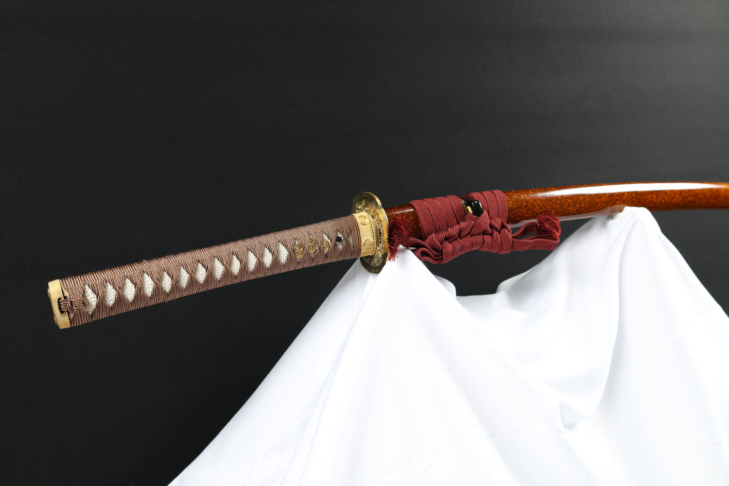 Custom Katana Sanmai-Forged Blade with Wave Motif and Amber Lacquer Saya